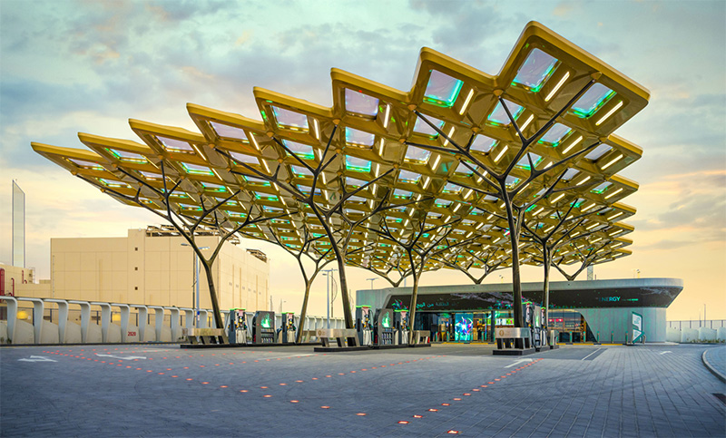 整个车站的设计形状类似于阿联酋国树 Ghaf 的外骨骼。八个树干支撑着车站的顶篷,由 22,500 平方米的碳纤维制成。第九个行李箱支撑着与主顶篷分开的充电站顶篷。 140 个两层 ETFE 靠垫形成了这些令人难以置信的檐篷。
