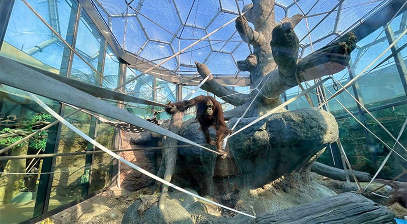 克利夫兰 Metroparks 动物园的雨林展览最近进行了翻新,其中包括标志性的透明测地圆顶。这个透明的圆顶由 840 平方米的ETFE 组成,位于猩猩区的上方。